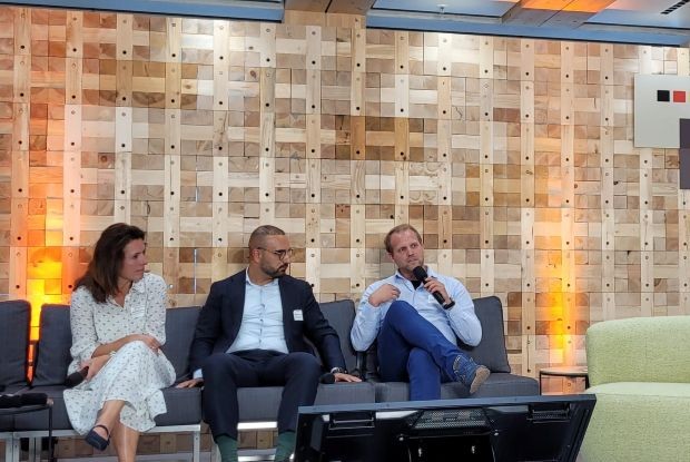 Von links: Snezana Michaelis (Vorstandsmitglied SAGA Unternehmensgruppe), Kassem Taher Saleh (Baupolitischer Sprecher Bündnis 90/Die Grünen Bundestagsfraktion), Adrian Blödt (Präsident HDI Holzbau Deutschland Institut)