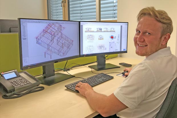 Mein Aufgabengebiet umfasst die komplette Arbeitsvorbereitung von Baustellen im Zimmerei- und Sanierungsbereich. Ich fahre auf Sanierungsbaustellen, um den Bestand aufzumessen. Danach pflege ich die Daten in unser System ein und erstelle die Werkplanung. Außerdem führe ich Gespräche mit Kunden und Bauleitern.